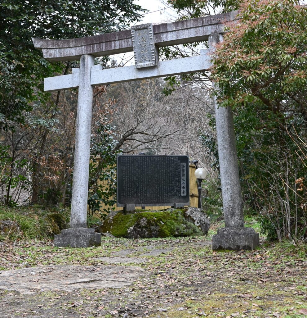 お坊さんは喜び足を湯につかり、わらじをはいて立ち去ろうとした時、お湯がふき出している所に神社がまつられているのを目にし、まつってあったお幣束を一枚取り、湯澤の川へ流し、湯のふき出ている所へ杖を「えい!」とばかり力を入れて、突き立て、「お幣札が流れ、たどり着いた所に熱いお湯が出る」と言い残したそうです